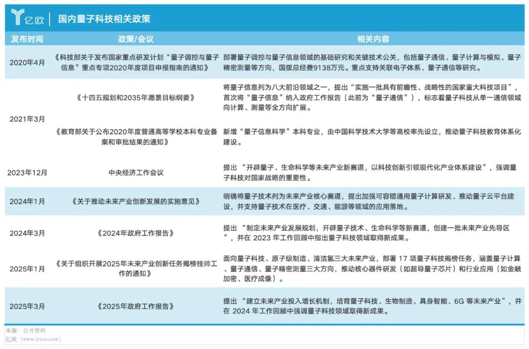 政策方面,“十四五”规划将量子信息列为八大前沿领域之一。在2024年和2025年连续两年的《 *** 工作报告》中提及量子计算,并将其与原子级制造和清洁氢并称为三大未来产业,这意味着量子计算成为未来产业发展重要方向,并处于战略高位。