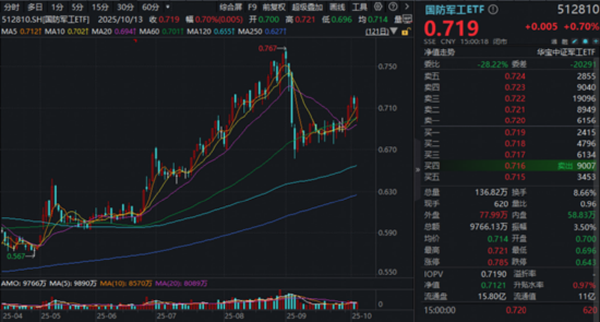 国防军工ETF(512810)全面表征该行业核心资产整体走势,盘中两度逆市翻红,尾盘再次发力,场内收涨0.7%,全天振幅3.5%,放量成交9766万元。值得关注的是,场内频现溢价,显示买盘势力较强,或有资金积极介入。