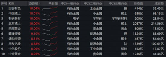 5只成份股强势涨停!细分方向来看,稀土龙头北方稀土、中国稀土涨停,涨超8%;黄金龙头涨停,涨超8%;铜业龙头涨停,锂业龙头涨超9%。