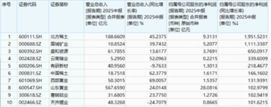 基本面上,根据2025年中报,中证有色金属指数60只成份股中,55股上半年实现盈利,占比超91%。从归母净利同比增速来看,10股实现翻倍,北方稀土净利暴增1951%居首,归母净利亦暴增1111%。