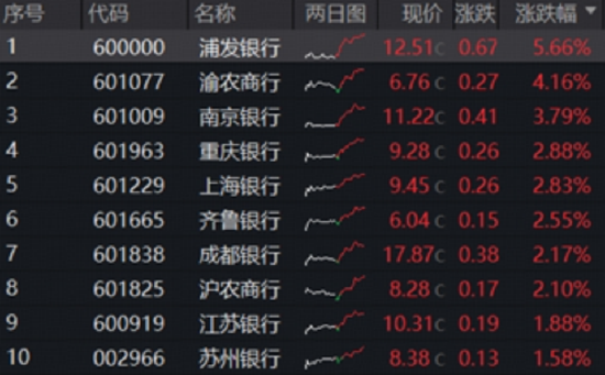 市场震荡加剧,银行板块再一次走出超额表现,彰显防御性。截至收盘,A股42只银行股大面积飘红,领涨5.66%,涨超4%,涨超3%,、、、、涨超2%。