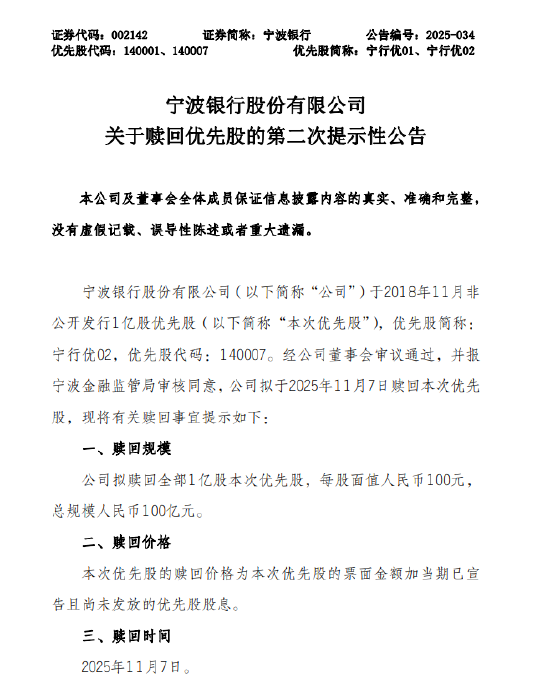 10月13日金融一线消息,(002142)发布公告,公司拟赎回全部1亿股本次优先股,每股面值100元,总规模100亿元。