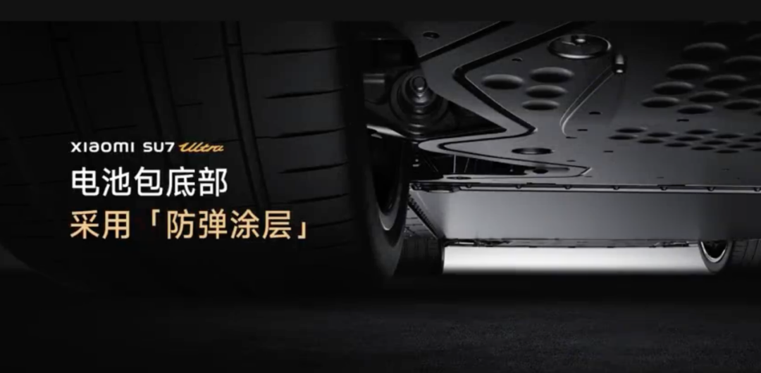 在第131集的小米汽车答网友问中,小米汽车声称小米SU7 Ultra电池包底部使用的防弹涂层被广泛应用于军事装备和航空航天器件等,例如装甲车的防雷板,军车铠甲,防弹头盔等,具有抗爆防弹效果。