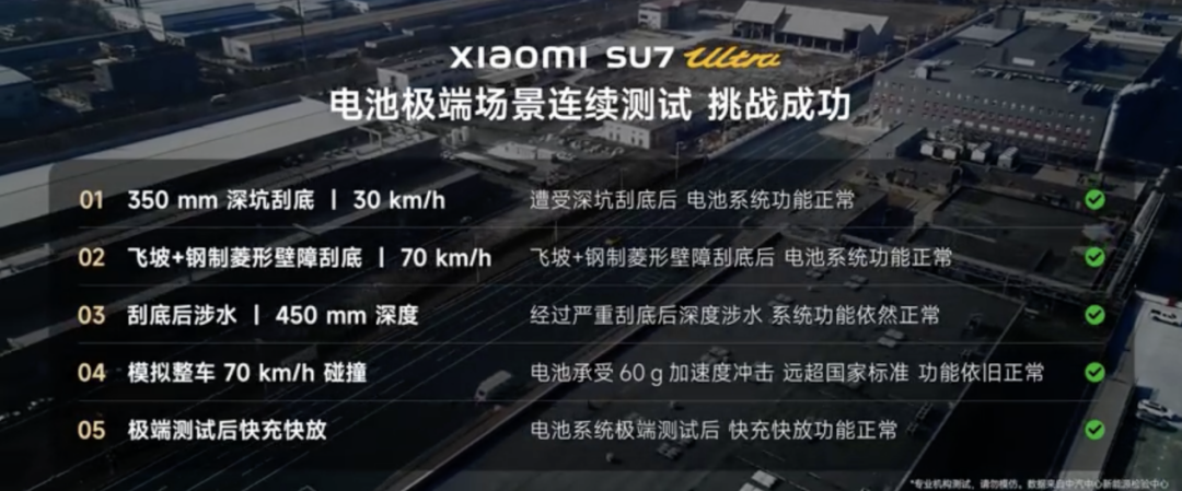 此外,小米汽车还在该问答中解释了中汽研给小米SU7 Ultra做的电池极端场景测试:模拟碰撞模拟了车辆高速撞墙、加速度超过60g时,电池所需要承受的巨大能量冲击。凹坑刮底也是非常接近用户日常生活的场景,模拟了车辆以30km/h的速度行驶时,被破损道路刮底的潜在情况。在刮底后,在电池受损程度不明的情况下直接进行涉水测试,既检验了电池包的抗刮擦和穿刺能力,也检验了其防水密封性能。