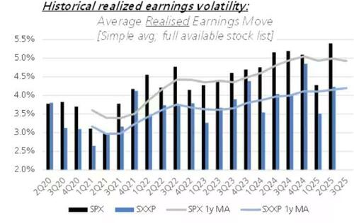瑞银集团策略师表示,美国上季度财报后的实际股价波动达到峰值,自2021年以来一直呈上升趋势,欧洲市场也是如此。花旗集团则指出股票相关性极低,实际和隐含波动率均接近至少十年来的更低水平。