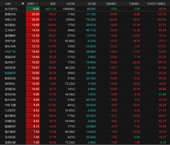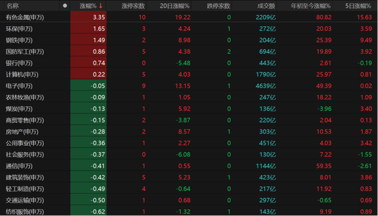 有色金属、环保、钢铁、军工、银行、计算机板块逆势飘红。电子板块早盘一度跌近5%,但在强势反弹下将跌幅收缩至0.05%,且有9只相关个股涨停。
