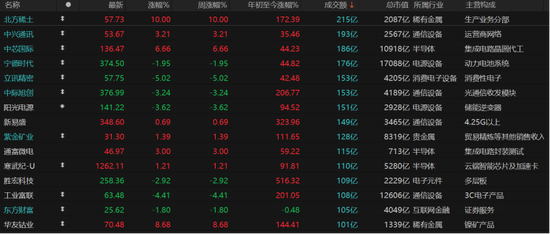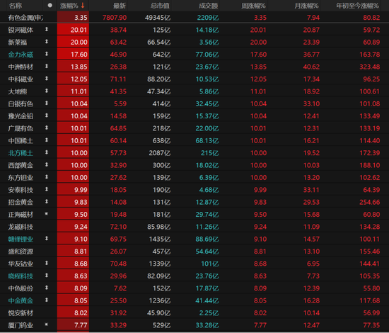 有色金属板块领涨,、“20cm”涨停,收涨17.6%报46.9元/股,、涨停。