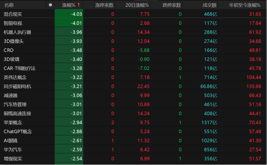 混合现实、执行器、CRO、CAR-T细胞疗法、英伟达概念、同步磁阻电机、减速器等概念跌幅超过3%。