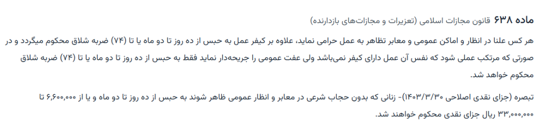 - 目前,伊朗《*刑法典》第五章第638条确立“强制佩戴头巾”法律义务条款仍然有效,尚未有任何 *** 部门或司法机构宣布法律变更。
