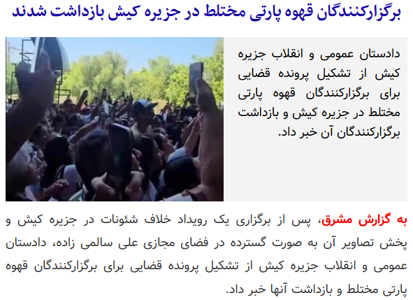 10月5日,伊朗مشرق新闻社报道称,南部基什岛当局逮捕了参加一场名为“咖啡派对”的部分年轻人,多家咖啡馆被关闭。当地检察官称,该活动属于“打破社会规范且违法的行为”。