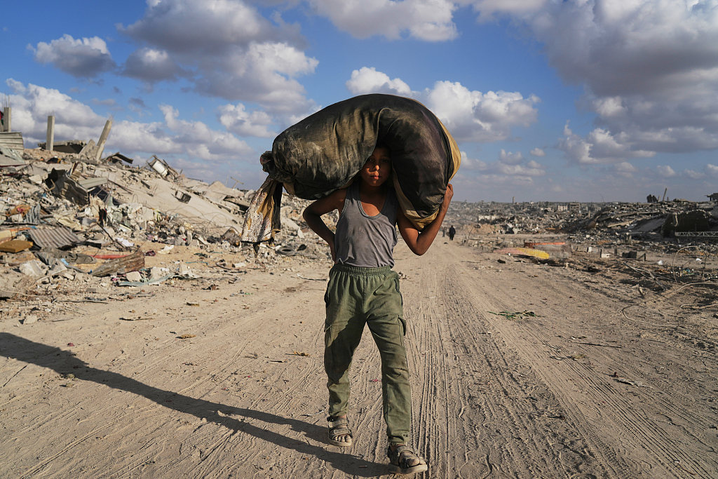 当地时间2025年10月12日,加沙城,以色列和哈马斯同意暂停冲突并释放剩余人质后,一名流离失所的巴勒斯坦男孩带着自己的物品走在满目疮痍的街道。视觉中国 图