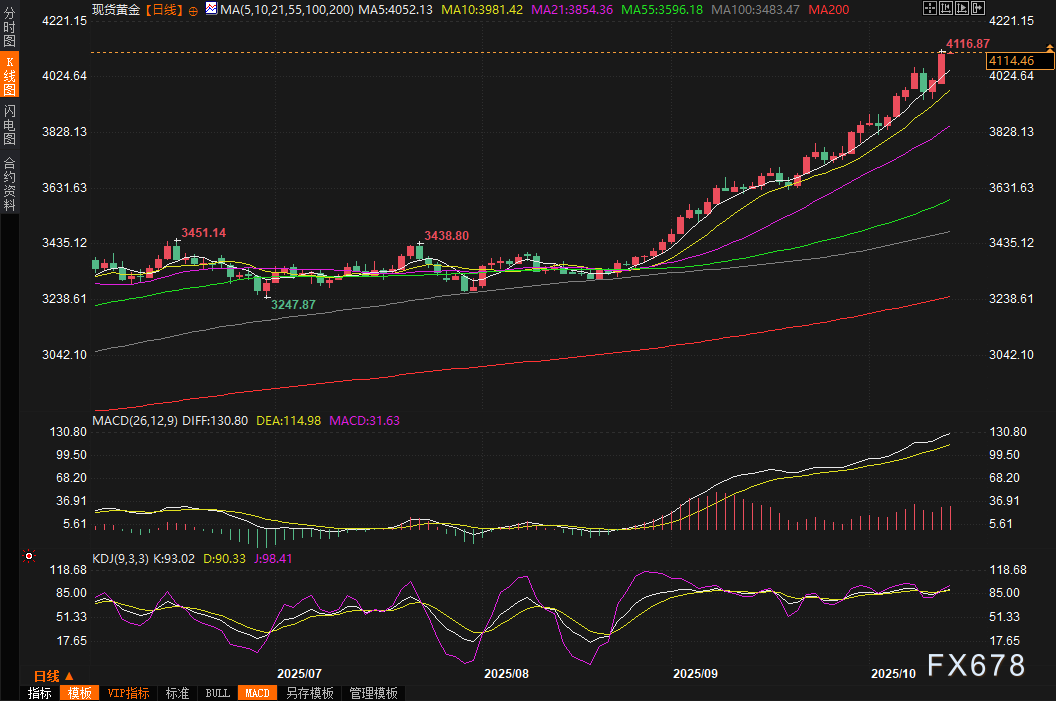 汇通财经APP讯——在全球经济风云变幻的当下,黄金作为避险资产的王者地位再次彰显。周一(10月13日)现货黄金价格首次突破每盎司4100美元大关,创下历史新高4116.87美元/盎司,当前国际贸易紧张、地缘政治不确定性和货币政策宽松预期,继续给提供上涨动能。黄金今年以来已累计上涨56%,在上周突破4000美元里程碑后,继续保持强劲势头。