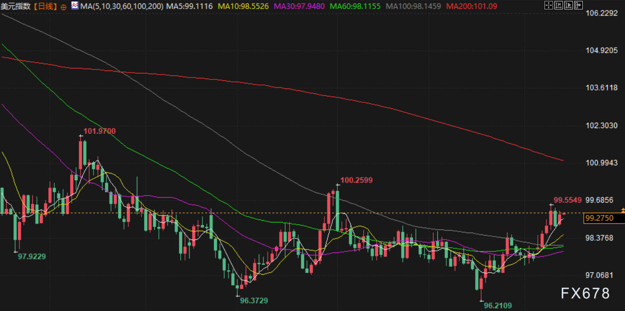 衡量美元兑一篮子其他六种货币表现的 纽约尾盘上涨 0.2%,报 99.25,从上一交易日的大跌中回升。