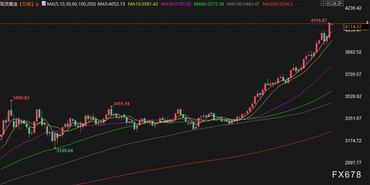 黄金周一首次突破每盎司4100美元,再创历史新高至4116.87美元,白银也刷新纪录高位,受贸易关系再度紧张和美国降息预期的影响。