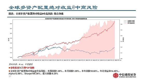 全球多资产配置绝对收益@中高风险:本周回报1.09%,本月回报1.09%,本年回报18.60%,年化收益率14.49%,Alpha12.58%,Sharpe195.36%,更大回撤-8.25% ;1年持有期:产品组合中位数 13.36%, 正收益占比 99.64%,基准组合中位数 2.44%,正收益占比 53.58%。