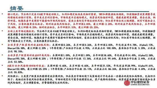 节后两个交易日A股市场波动较大,红利和稳定板块表现相对靠前,TMT和新能源板块领跌,但前期融资政策调整导致的情绪扰动预计有限。受中美关系利空影响,市场再度开启避险模式,投资者风险偏好回落,港股美股明显调整,黄金走强,铜价回落。短期来看中美博弈可能影响市场风险偏好,需要注意防范市场流动性风险;但如果市场出现大幅调整,则有可能机会大于风险,注意把握黄金坑机会。绝对收益低风险组合,本年回报2.83%,更大回撤-2.20%。绝对收益中高风险组合,本年回报18.60%,更大回撤-8.25%。相对收益组合,本年回报31.53%,更大回撤-25.25%。