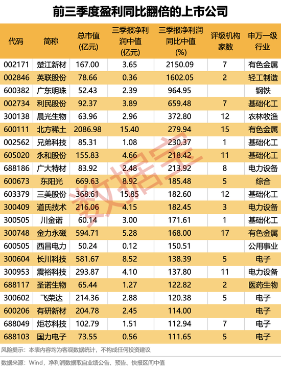 从净利润变动看,以报告数据/预告中值统计,共计22股前三季度盈利同比翻倍增长。、、、、5股净利润同比增幅超过300%,依次为2150.09%、1602.05%、964.95%、659.48%、372.8%。