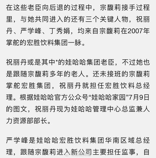 据2024年7月5日的工商变更信息,宗馥莉在宏胜饮料集团的职位由董事长变为执行董事,同时,公司董事施丽娟、施幼珍退出。 *** 息显示,施幼珍为宗庆后的妻子,亦为宗馥莉的母亲。在2022年,宗馥莉也已卸任宏胜饮料集团的法定代表人,变更为祝丽丹。