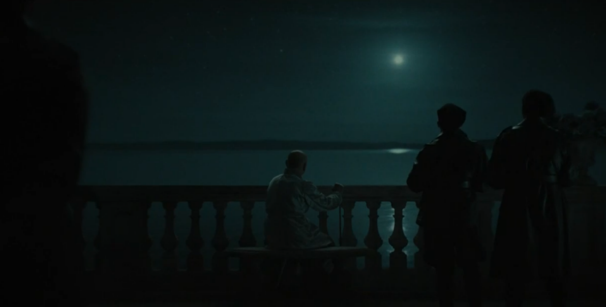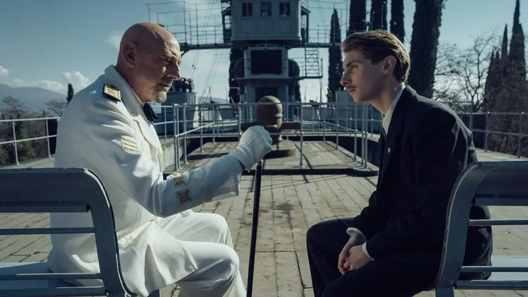 邓南遮在加尔达湖畔过着放逐生活,日夜仅有寥寥数人相伴。亲近法国的他对墨索里尼和希特勒的盟约无能为力,他在片中有些自嘲地告诉科米尼:“这些花园对我来说已是森林,加尔达湖对我来说就是海洋。”阜姆的时光远逝,站在阳台前向千万人演讲者是“世纪之子”墨索里尼,“不良诗人”则被封锁在“天空之下”。直到有一天,他的好友古列尔莫·马可尼去世;直到有一天,邓南遮最后一次见到阜姆的战友,眼睛患上畏光症的他艰难走向阳台,最后一次面对不再循环的历史亮相。