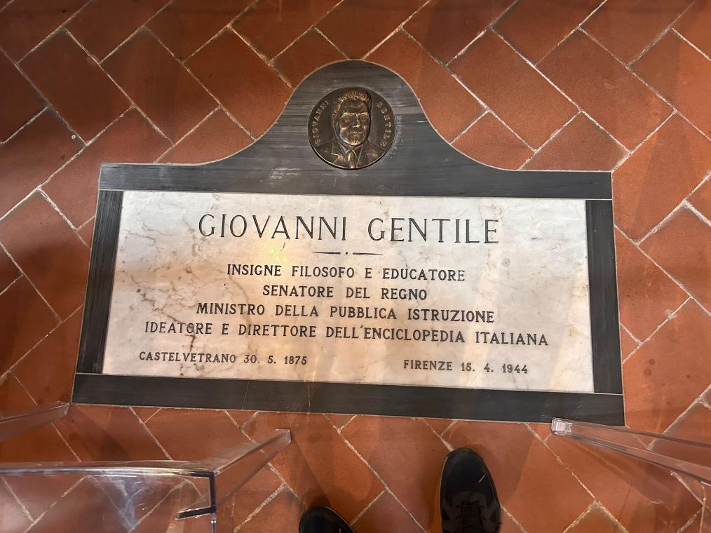 如今,秦梯利被安葬在佛罗伦萨的圣十字圣殿(Basilica di Santa Croce)。值得注意的是,该地也是米开朗琪罗、伽利略、马可尼(Guglielmo Marconi)等民族伟人的安息之地,被誉为“意大利的先贤祠”。也就是说,一个“法西斯分子”的遗骸进入了意大利民族的“先贤祠”。2024年2月,笔者也曾探访此地,发现秦梯利之墓位于教堂角落不对外开放的部分。我们问询神父后才得知,为了避免争议,秦梯利之墓是不对公众开放的。同行的朋友遂用意大利语向神父请求,称我们是学习该领域的学生,特地来此寻找秦梯利之墓,神父便准许我们参观五分钟,领着我们越过谢绝游客参观的障碍物。