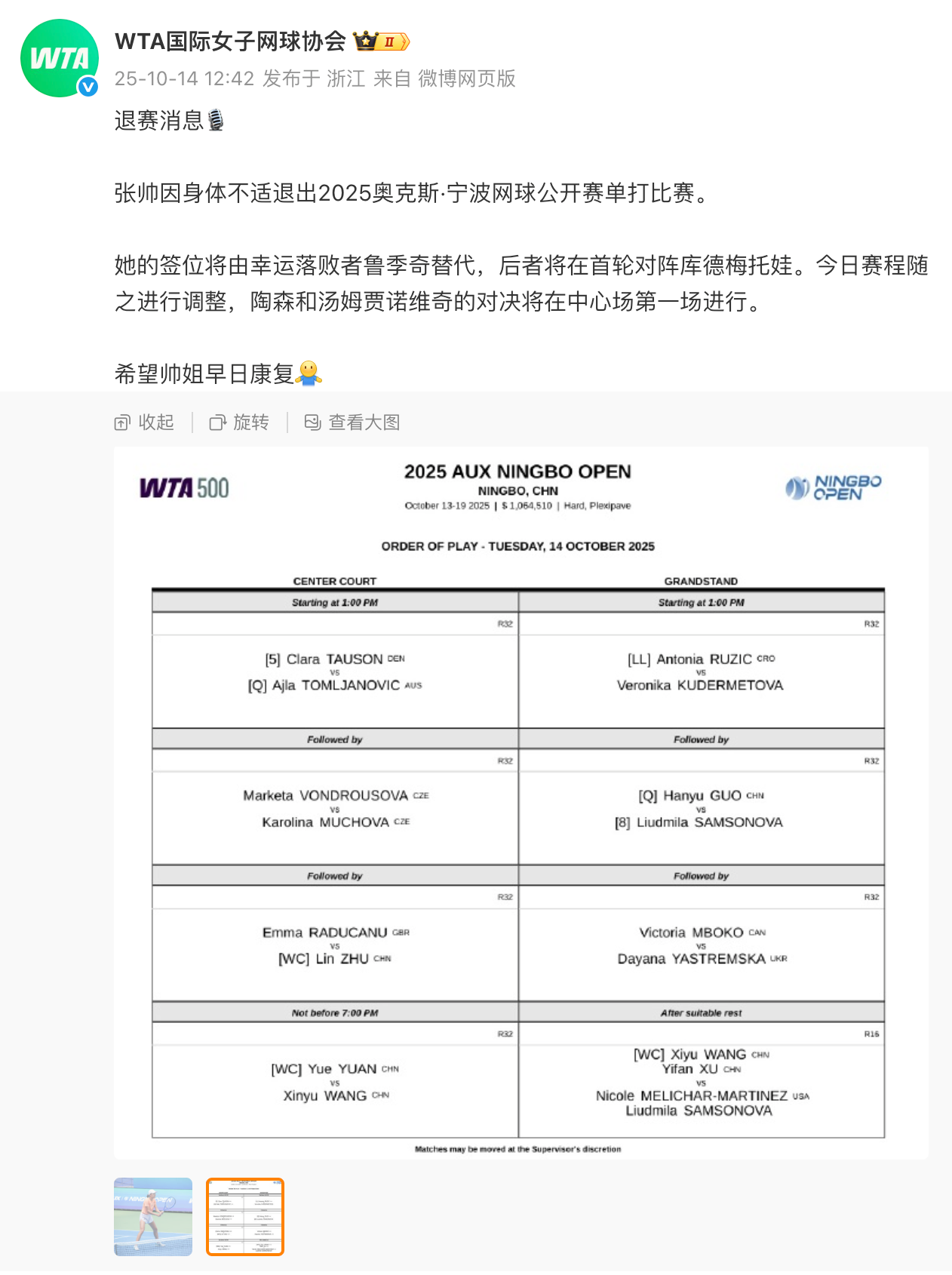 10月14日,据@WTA国际女子网球协会 消息,张帅因身体不适退出2025奥克斯·宁波网球公开赛单打比赛。她的签位将由幸运落败者鲁季奇替代,后者将在首轮对阵库德梅托娃。今日赛程随之进行调整,陶森和汤姆贾诺维奇的对决将在中心场之一场进行。