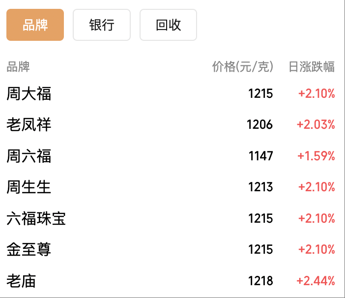 受国际金价影响,国内珠宝品牌足金首饰价格也大幅上涨,首次站上1200元/克。其中老庙足金饰品价格为1218元/克,比前一日上涨29元/克;周大福、六福珠宝、金至尊足金饰品价格为1215元/克,比前一日上涨25元/克;周生生足金饰品价格为1213元/克,比前一日上涨25元/克;老凤祥足金饰品价格为1206元/克,比前一日上涨24元/克。