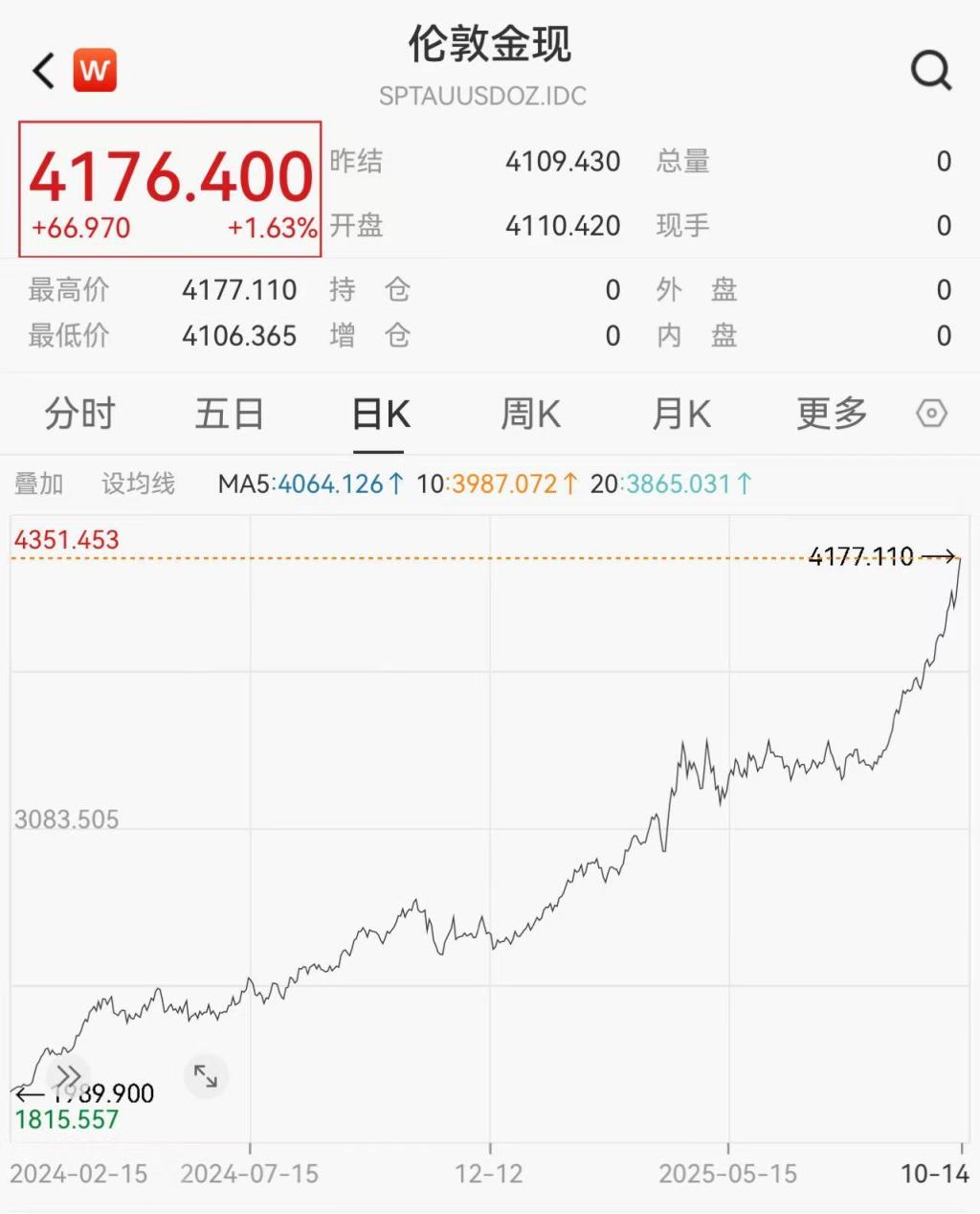 一路狂飙,现货黄金突破4170美元/盎司。