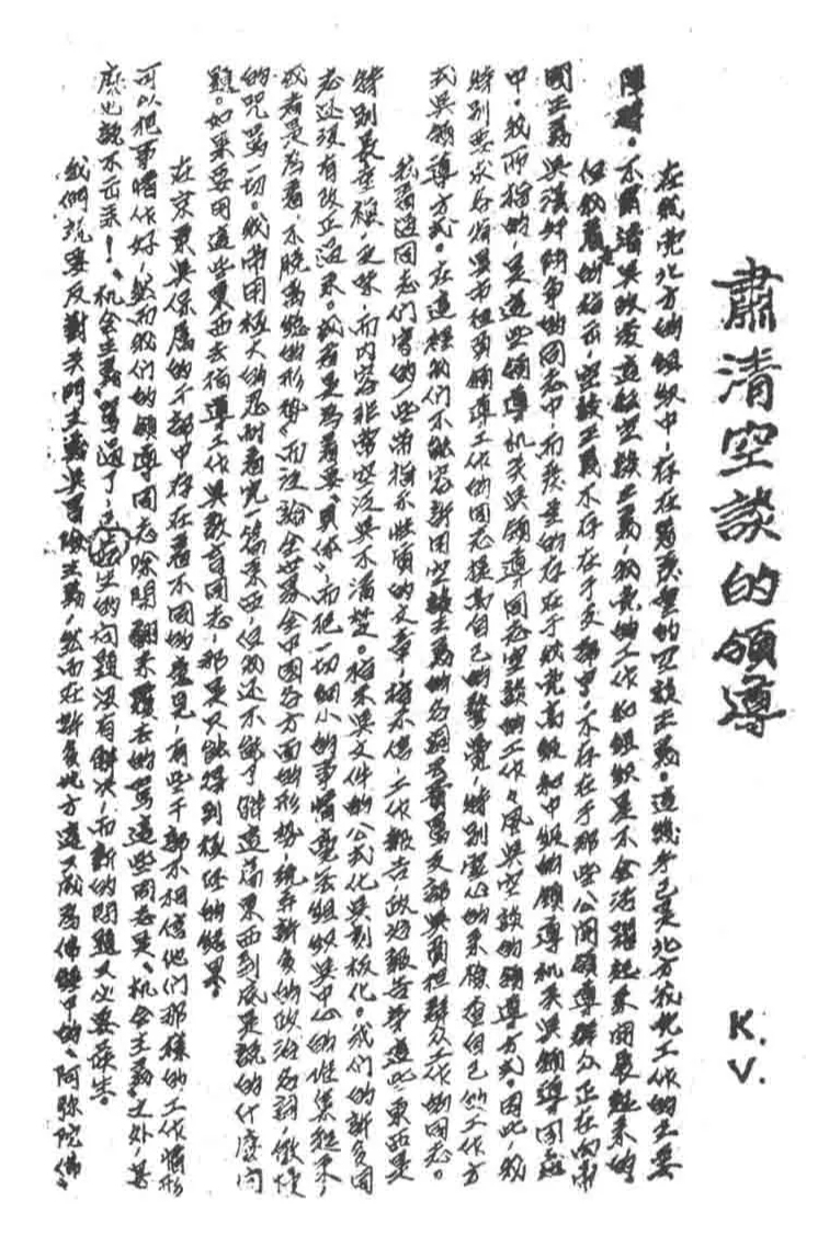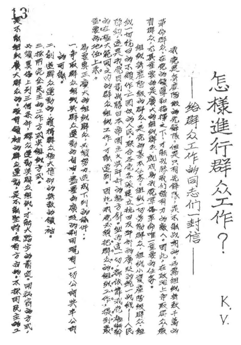 *** 主持北方局工作后,以“K.V”为笔名在《火线》上发表了多篇文章,如《肃清立三路线的残余——关门主义冒险主义》《肃清空谈的领导》《怎样进行群众工作——给群众工作的同志们的一封信》等。批评党内长期存在的关门主义和冒险主义弊端,阐述中国 *** 的白区工作的方针策略,着力指导平津地区的一二·九运动。