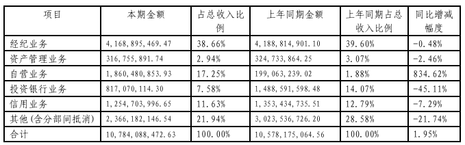 而投资银行业务、其他业务、信用业务、资产管理业务、经纪业务的营业收入分别为8.17亿元、23.66亿元、12.55亿元、3.17亿元、41.69亿元,同比分别减少了45.11%、21.74%、7.29%、2.46%、0.48%。