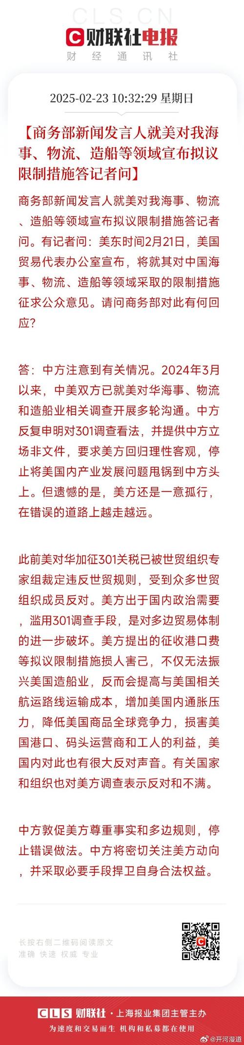 商务部新闻发言人就美对华造船等行业301调查限制措施落地答记者问,具体内容如下。