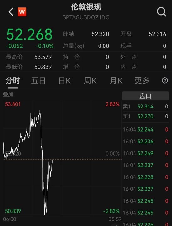 Wind数据显示,截至北京时间10:59,伦敦现货白银突破53美元/盎司,刷新历史更高纪录,本月以来累计涨幅超13%。不过随后大幅跳水,截至16:03,跌幅为0.1%。