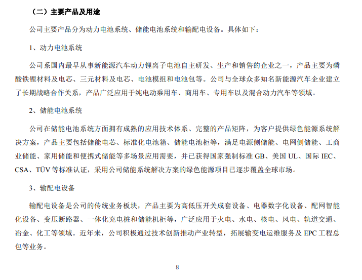 包括输配电设备、电池材料(如正极材料、电解液)的研发与销售,以及电池回收梯次利用等配套服务。