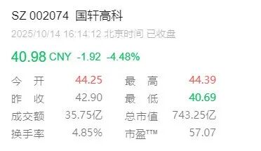10月14日,国轩高科跌近5%,股价报40.98元/股,总市值为743.2亿。