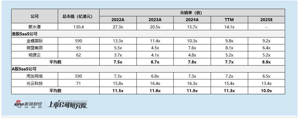 本次公司IPO市值对应的2024年市盈率高达1175倍,显著畸高。市销率方面,2024年为15.7倍,远超港股SaaS公司7.6倍的平均水平,TTM市销率14.1倍也高于行业7.7倍的均值。即便是港股SaaS龙头金蝶国际,其590亿港元市值对应的2024年市销率仅10.3倍、TTM市销率9.8倍,仍显著低于聚水潭的市销率。叠加IPO未预留足够估值安全垫,公司上市后面临破发的可能性已成为市场普遍担忧。