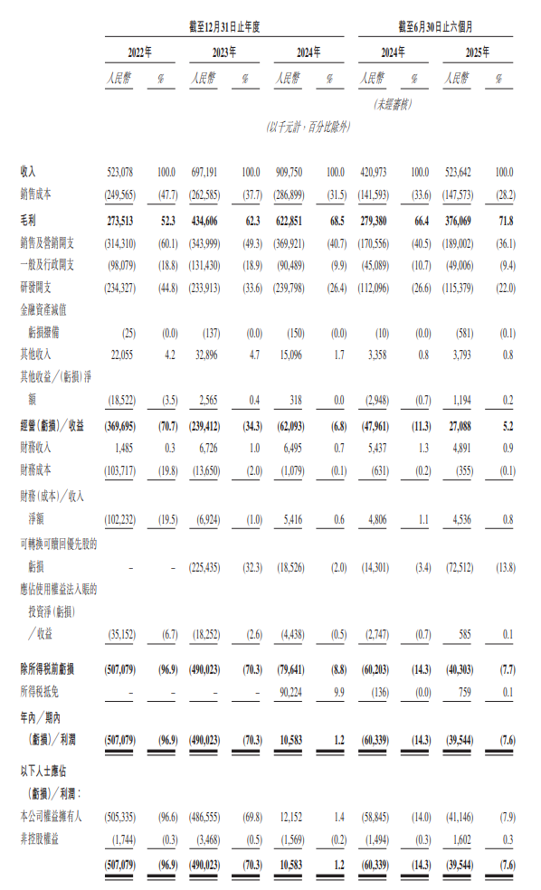 财务方面,2022-2024年公司收入分别为5.2亿元、7.0亿元、9.1亿元,三年复合增速31.9%,展现出一定增长韧性;但2025年上半年收入5.2亿元,同比增速降至24.4%,增长动能有所减弱。盈利端,公司成立10年后终于在2024年实现账面扭亏——2022-2024年净利润分别为-5.1亿元、-4.9亿元、0.1亿元,但2024年盈利主要依赖约9000万元的递延所得税贡献:若剔除该因素,2024年公司除所得税前仍亏损约8000万元,实质盈利能力尚未稳固。2025年上半年,公司实现经营收益2.7亿元,但受可转换可赎回优先股亏损调整影响,整体净亏损0.4亿元。整体来看,虽然公司在收入端有较明显的增速,但是盈利端的表现尚不稳定,且仍然有一些“非常事项”影响最终的盈利水平。虽然随着上市后可转换可赎回优先股亏损清零,公司会减少一定的亏损压力,但是在经营端公司能否保持盈利,仍需拭目以待。