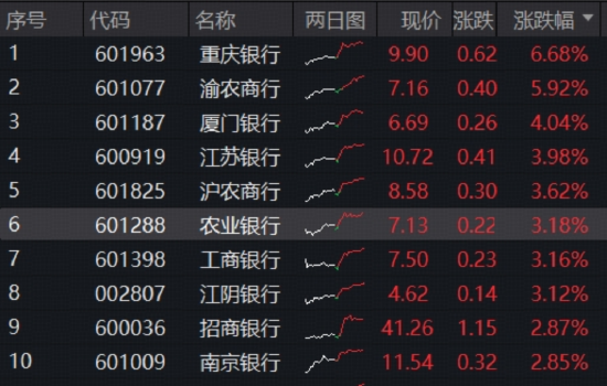 今日银行再度走强,成为支撑大盘的主力。截至收盘,A股42只银行股全线飘红,超半数个股涨逾2%,城农商行表现亮眼,领涨6.68%,涨近6%,涨超4%,、等涨超3%。