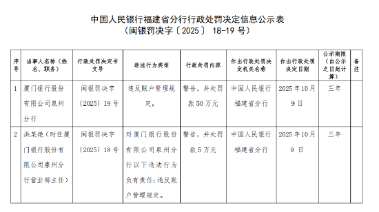 10月14日金融一线消息,据中国人民银行福建省分行行政处罚决定信息公示表显示,股份有限公司泉州分行因违反账户管理规定,被警告,并处罚款50万元。同时,洪某艳(时任厦门银行股份有限公司泉州分行营业部主任)对厦门银行股份有限公司泉州分行以下违法行为负有责任:违反账户管理规定,被警告,并处罚款5万元。