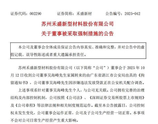 10月13日晚间,A股上市公司苏州禾盛新型材料股份有限公司(以下简称“”)公告称,公司董事会于10月12日收到公司董事吴海峰家属转来的由广东省湛江市公安局出具的《拘留通知书》,公司董事吴海峰因涉嫌违法发放贷款正在公安机关配合调查。