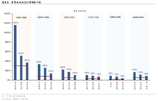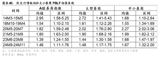 领涨个股分化,业务弹性/主题机遇/次新股等是共性特征。复盘过去行情券商板块内部情况,每轮领涨公司有差异,但有一定的共性特征。典型的如:1)业务弹性强,如2014-2015年的(互联网券商经纪业务)、2019年的(科创板投行业务增量)、2021年的与(旗下资管业务价值重估);2)板块主题性机遇:如2019年的中信建投(并购重组)、2020年的(银行系券商,整合预期)、2023年的(收购事件);3)次新股或流通市值小:如2014年的、2023年的。整体而言,中小券商估值有更强的弹性,超越行业平均估值。