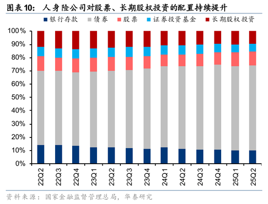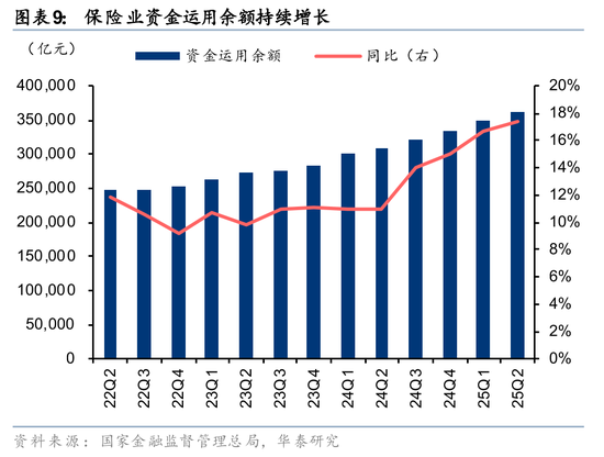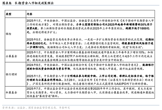 各部委及监管部门形成政策合力。在中央定调下,各部委及监管机构正形成政策合力,共同推动资本市场高质量发展。国务院发布新“国九条”作为纲领, *** 协同落实“1+N”政策体系、强化“长牙带刺”监管,央行提供流动性支持,金融监管总局鼓励保险资金入市。这些举措旨在引入中长期资金、活跃市场并提振投资者信心,共同构建稳定健康的资本市场。国家金融监督管理总局上调保险资金权益资产配置比例上限、进一步扩大保险资金长期投资的试点范围、将股票投资的风险因子进一步调降10%(截至25Q2末,人身险公司配置股票规模2.87万亿元,同比增长48%、季度环比增长9%,增配显著)。一系列重磅政策密集出台,旨在引导和鼓励中长期增量资金大规模入市,为资本市场奠定坚实稳定的基础。