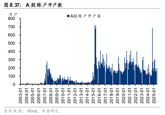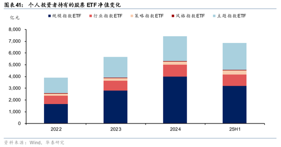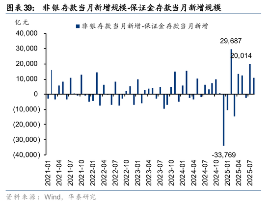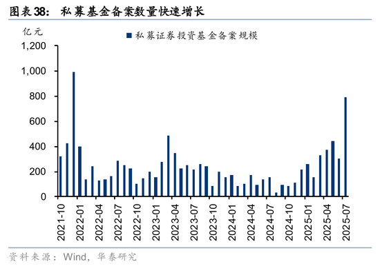 居民对权益市场配置进入新的水位与中枢。今年以来,居民对权益市场的配置进入新的水位与中枢。我们从以下数据观察居民入市:1)新开户:根据上证所统计,2024年10月以来沪深两市新开账户数达到2610万户,相较2023年全年增长22%,且25M7处于196万户的较高水平。2)私募新发:私募证券投资基金备案规模快速上行,25M7单月备案规模达793亿元,接近21M12单月峰值,反映出高净值客群对权益市场配置逐步提升。3)存款结构变化:我们以非银存款当月新增-保证金存款当月新增数据衡量资金从银行与非银机构之间的迁徙情况,25M2达到近10年以来的高点2.97万亿元,随后25M4-25M5、25M7-25M8连续突破万亿元;4)券商客户资金:25Q2末证券公司客户交易结算资金2.82万亿元,季度环比增加2400亿元、规模仅次于15Q2末的高点;5)股票ETF配置:2024、25H1末个人投资者对股票ETF的配置规模相较过去年份显著增长。
