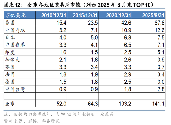 A股、港股在全球资本市场的重要性提升,券商面临的经营环境、市场容量不同以往。根据彭博统计数据,2025年8月末中国内地交易所总市值排名全球第二,仅次于美国,较2010年的第五名有显著提升,占全球资本市场总市值的比例从6%提升至9%。同时,香港市场成为优质资产上市的首选市场之一,2025年上半年港交所IPO融资额排名全球之一。