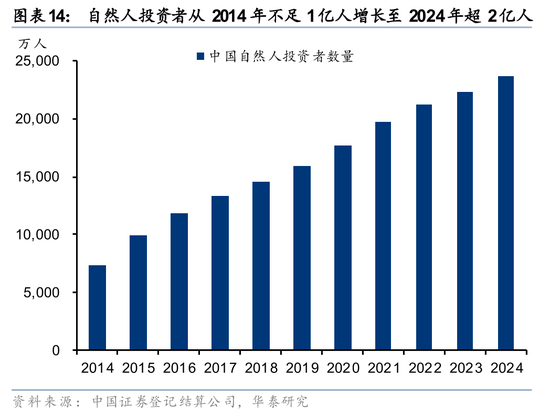 投资者和上市公司规模扩容,券商业务边界扩张。过去十年市场参与者数量实现两倍以上增长,国内自然人投资者数量从2014年末的不足1亿人增长至2024年末的2.36亿人同时,上市公司家数从2014年的2500多家实现翻倍增长至5400余家(截至9月末),总市值从37万亿元增长至突破100万亿元,大幅提升184%,证券化率从57%提升至80%。投资者和上市公司扩容带来财富管理、融资等业务需求的增长,同时资本市场双向开放推升国际业务需求,券商业务边界持续扩张。