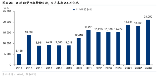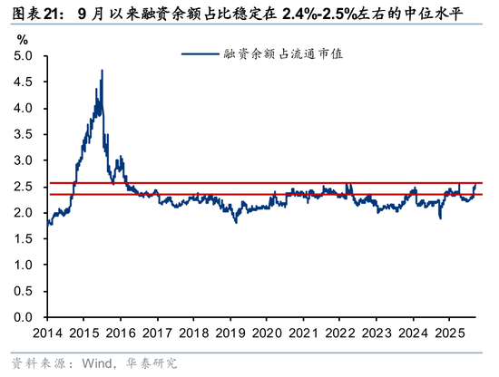 融资余额连创历史新高,余额占比、买入额占比稳定在历史中高位。融资余额连创历史新高,突破2.4万亿元。2025年1-9月日均余额19,322亿元,同比+32%,为历史年度均值新高。但从融资余额占流通市值的比例看,9月以来仍稳定在2.4%-2.5%左右的中位水平,融资买入额占A股成交额比例维持10%-12%的历史中高位水平。