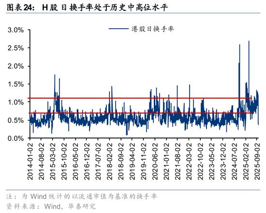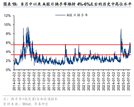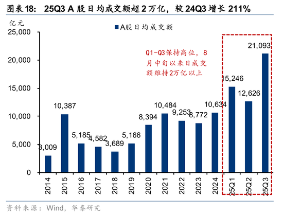 A股成交额放量且持续性增强,换手率处于历史中高位水平。8月13日以来,A股成交额始终维持在2万亿以上,部分交易日突破3万亿,交易活跃度持续。2025年1-9月日均成交额为16496亿元,同比+107%,创历史年度日均新高。25Q3 A股日均成交额超2万亿,较24Q3增长211%。从换手率维度看,8月中旬以来基本维持4%-6%左右的历史中高位水平。