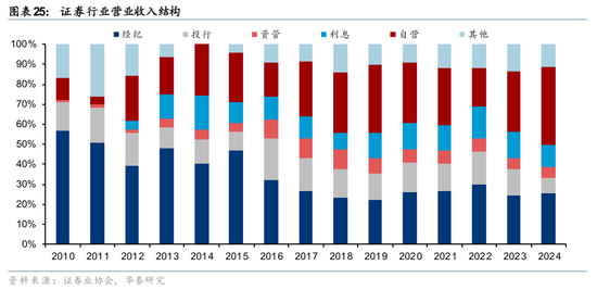 券商业务多维度改善,低位修复下的增长更具持续性。过去每轮券商行情均有业绩支撑,如2014-2015年两融迎来大发展,14年行业利息收入实现翻倍增长;2018-2020年注册制改革红利下投行业务扩容,同时衍生品市场扩张,投资弹性亮眼。本轮行情下,券商各业务线经营环境显著改善,业绩低位复苏,增长持续性明显加强。25H1上市券商实现归母净利润1040亿元,同比+65%,投资、经纪是业绩增长的核心驱动力,净收入分别同比+54%、+44%;同时投行业务稳步修复,净收入同比+18%。