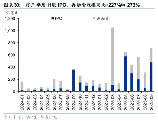 香港市场流动性修复,交投活跃,企业赴港上市意愿显著增强。人民币升值预期不断强化,年初以来港股流动性改善,股票市场交易活跃。2025年1-9月日均成交额2,563亿港元,同比增长52%;25Q3 H股日均成交额2862亿港元,较24Q3增长141%;以流通市值衡量的换手率提升至历史中高水平。同时,企业赴港上市意愿明显增强,2025年1-9月港股首次招股家数合计68家,募资总金额已超过2024年全年,内地企业IPO项目频出,且不乏、、等优质企业。