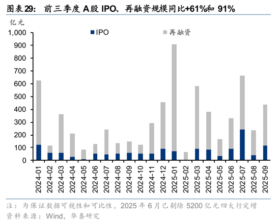 内地和港股融资市场明显回暖,投行业务低位修复。年初至9月末,A股IPO、再融资规模分别达773亿元和2989亿元(剔除四大行定增扰动),同比增长61%和91%,券商债券承销规模稳步增长,为12.08万亿元,同比+18%。同时,香港市场成为优质资产上市的首选市场之一,2025年上半年港交所IPO融资额排名全球之一。2025年1-9月H股IPO、再融资规模分别为1825亿港元和2286亿港元,较去年同比大幅增长227%和273%,景气度显著修复。