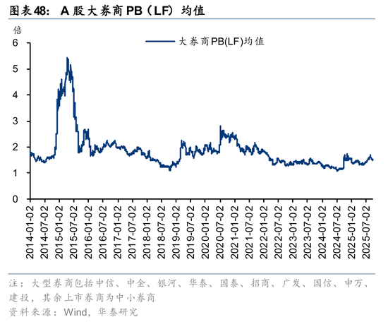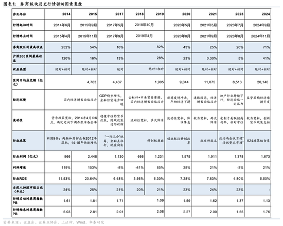 3)资金迁徙是行情的:典型如2014-2015年,政策、资金、市场共振催生牛市,此阶段成交额从2000亿左右水平攀升突破2.3万亿,场内外杠杆资金加速入市,融资余额峰值较2014年初增长5余倍,行业净利润连续两年同比超100%,板块走出系统性行情,PB(LF)估值峰值超5倍,较行情启动前上行约185%。