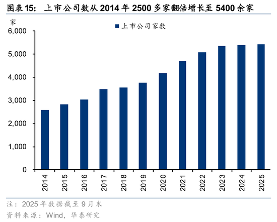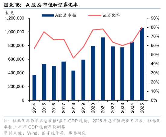 市场容量仍有较大拓展空间。尽管中国拥有庞大的经济体量(2024年GDP达18.7万亿美元)和数量可观的上市公司(截至25年9月末有5,516家,接近于美国),但其资本市场总市值(14.9万亿美元)与美国(89.5万亿美元)相比仍有显著差距。更关键的是,衡量资本市场深度的证券化率(总市值/GDP)显示,中国大陆的证券化率仅为80%,远低于美国(307%)、英国(198%)、日本(187%)和韩国(125%)等主要经济体。未来通过深化改革和发展,资本市场在市值规模和深度方面都存在较大的增长潜力。